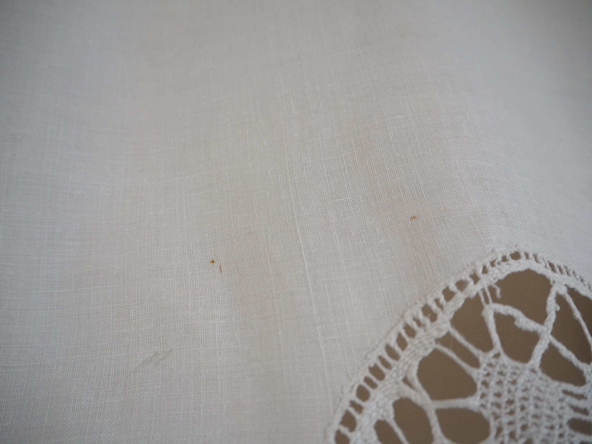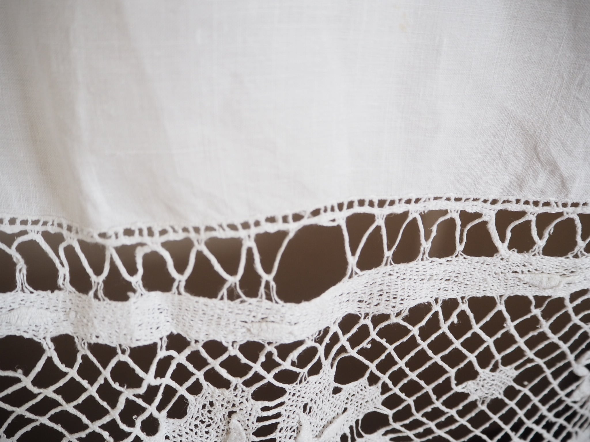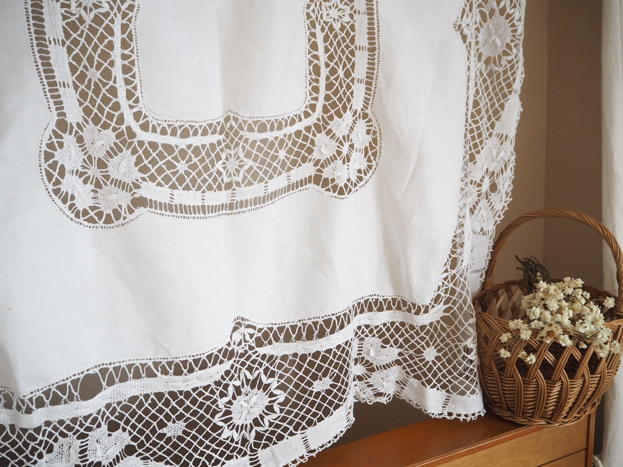 イギリスのアンティークレースのテーブルクロスです。リネンにかわいいレースがほどこされています。ハンドメイドで編まれたレース部分がなんとも愛らしい雰囲気です。アンティーク のため、網目が空いていたり、シミも何ヶ所かございます。
