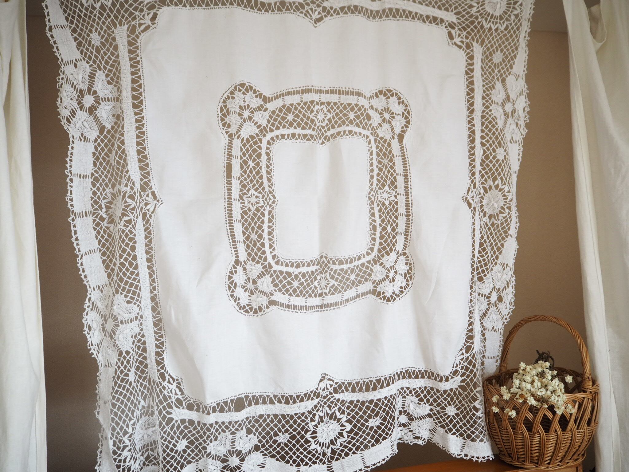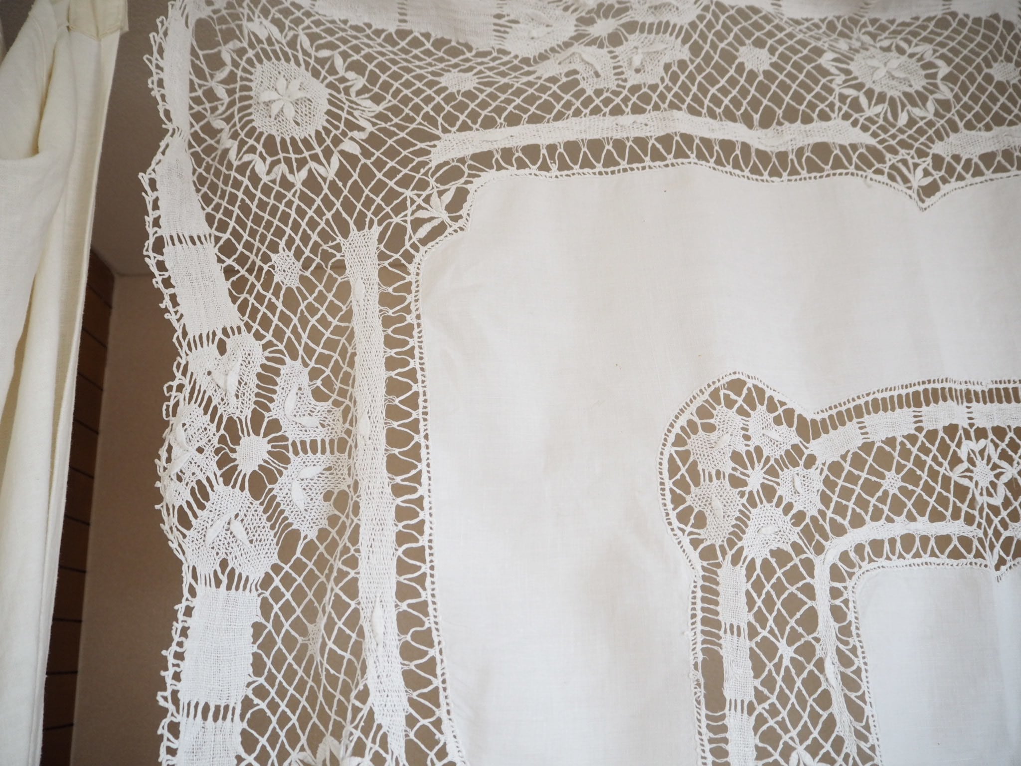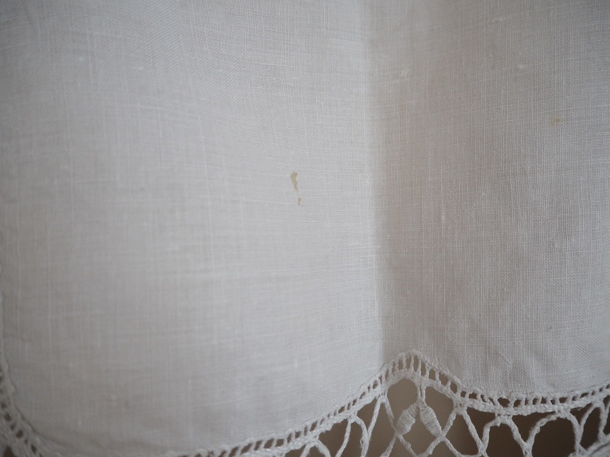 イギリスのアンティークレースのテーブルクロスです。リネンにかわいいレースがほどこされています。ハンドメイドで編まれたレース部分がなんとも愛らしい雰囲気です。アンティーク のため、網目が空いていたり、シミも何ヶ所かございます。