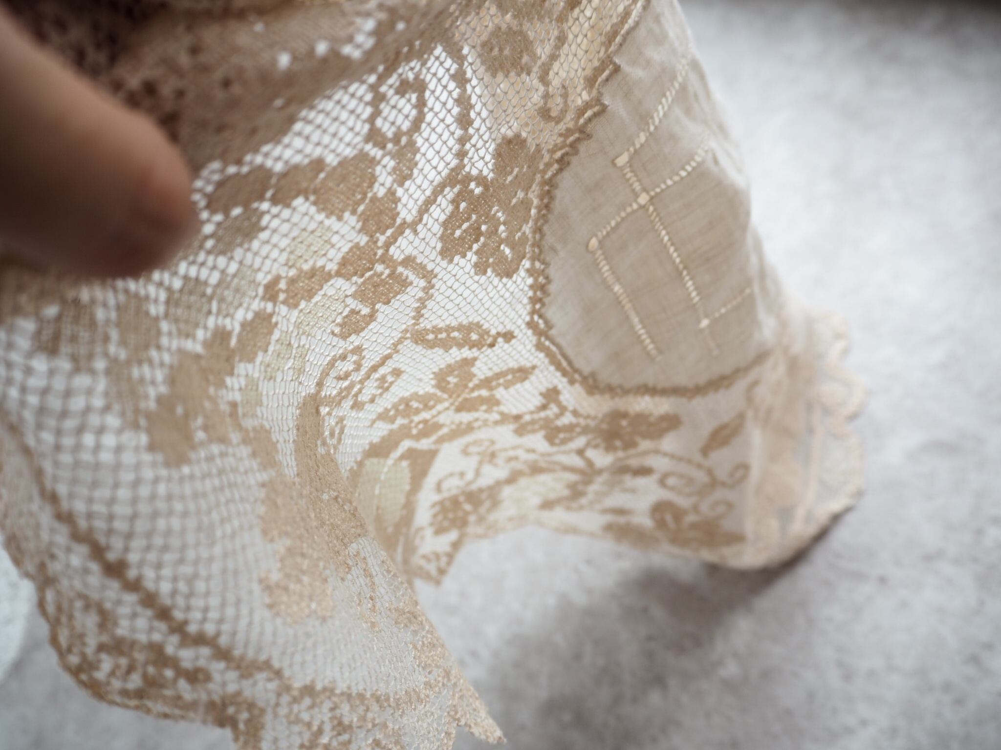 シルクとリネンの糸で作られたこのレースは、手触りがとても滑らかでとても肌触りが良くて、繊細なレースでうっとりします。