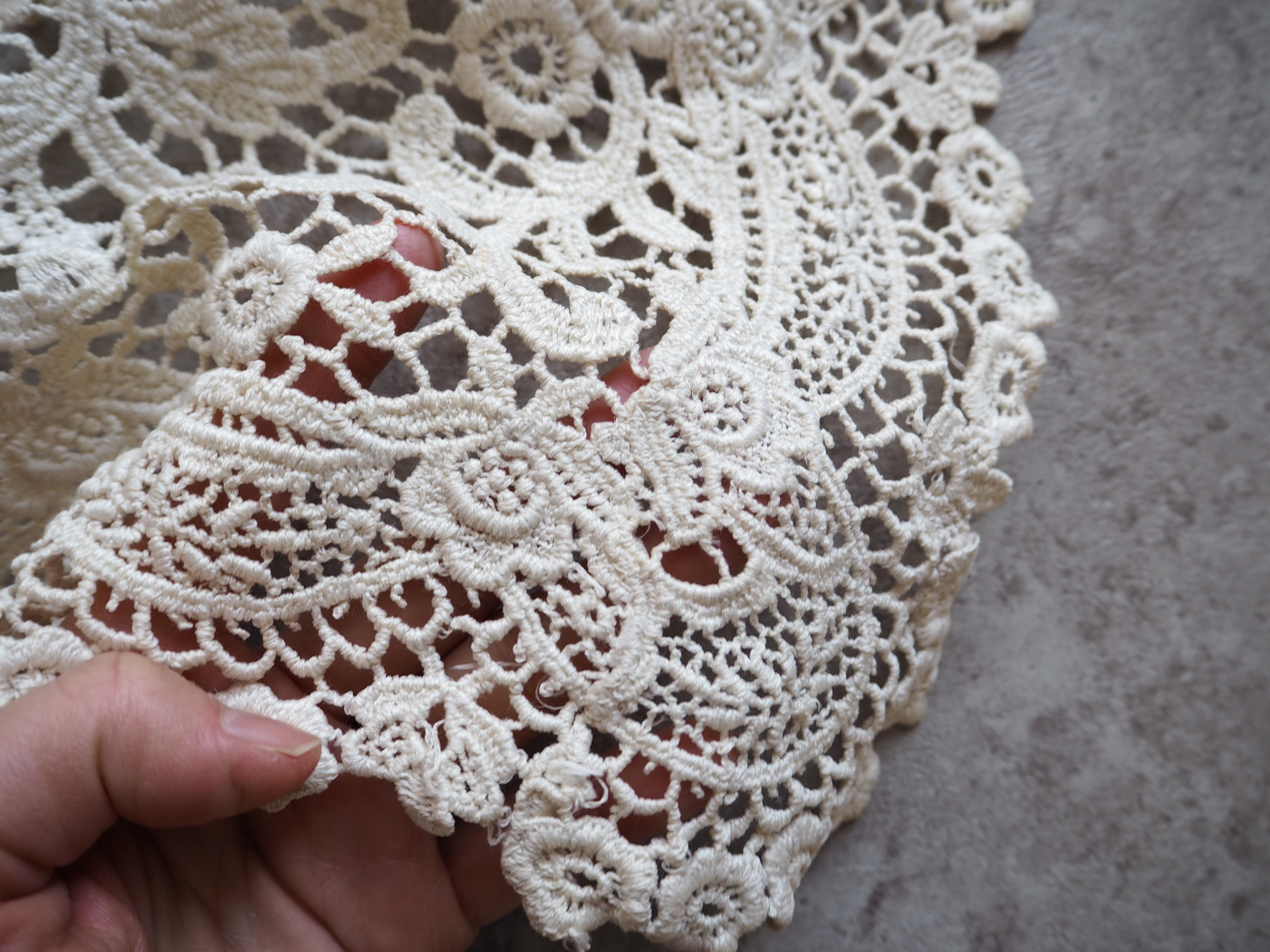 エクリュ色の糸を使った少し厚みのある糸を使ったレース。