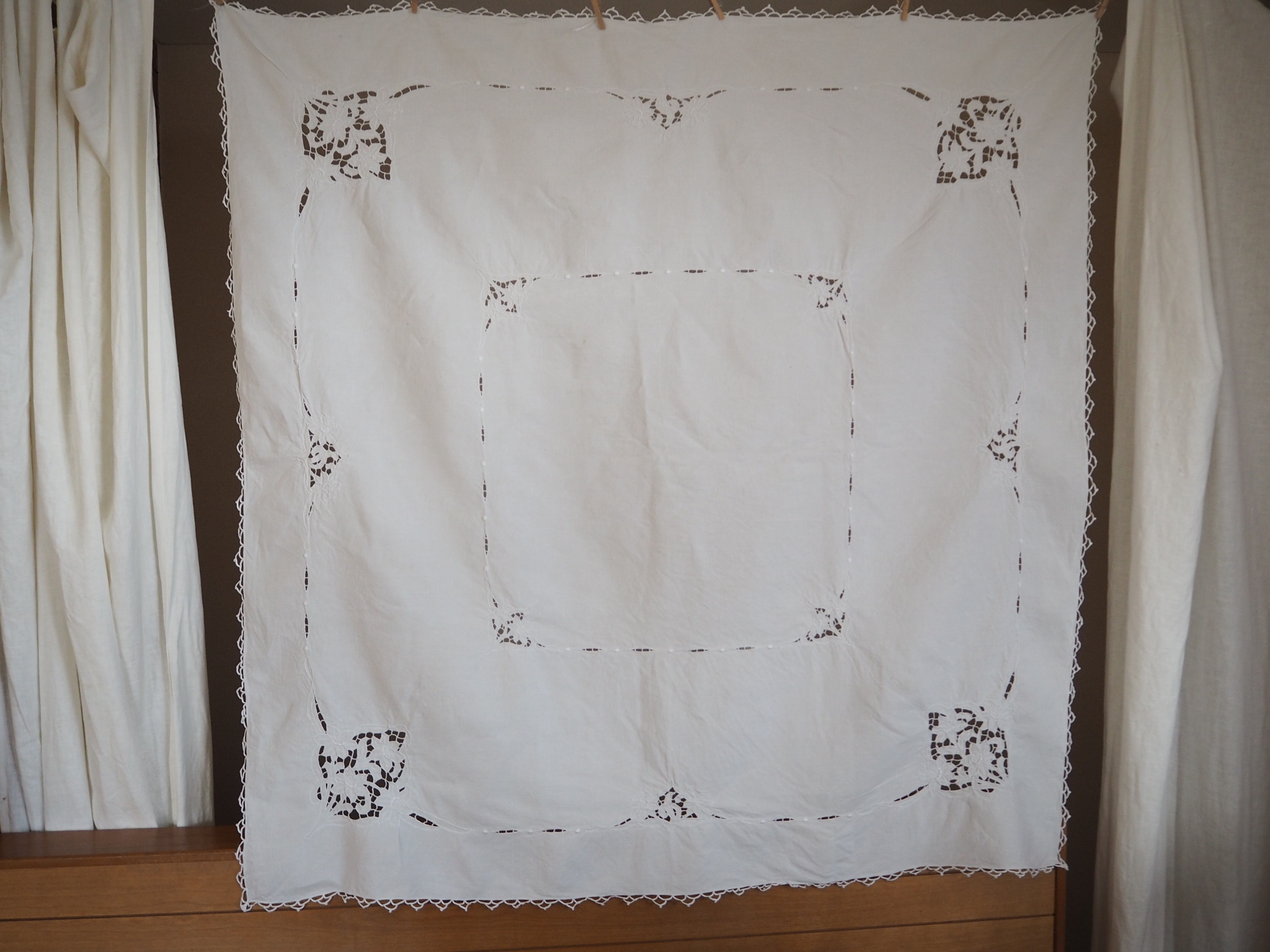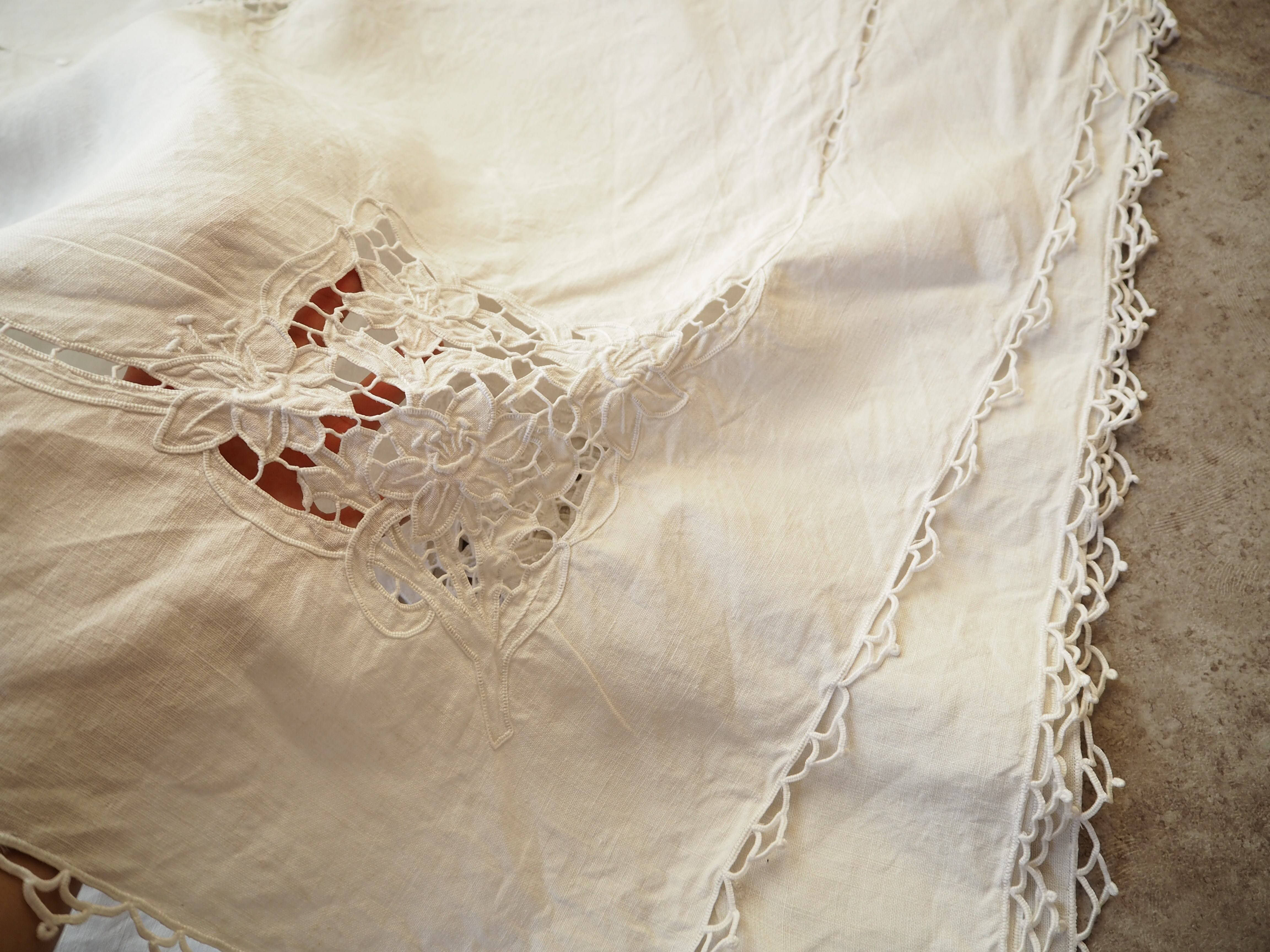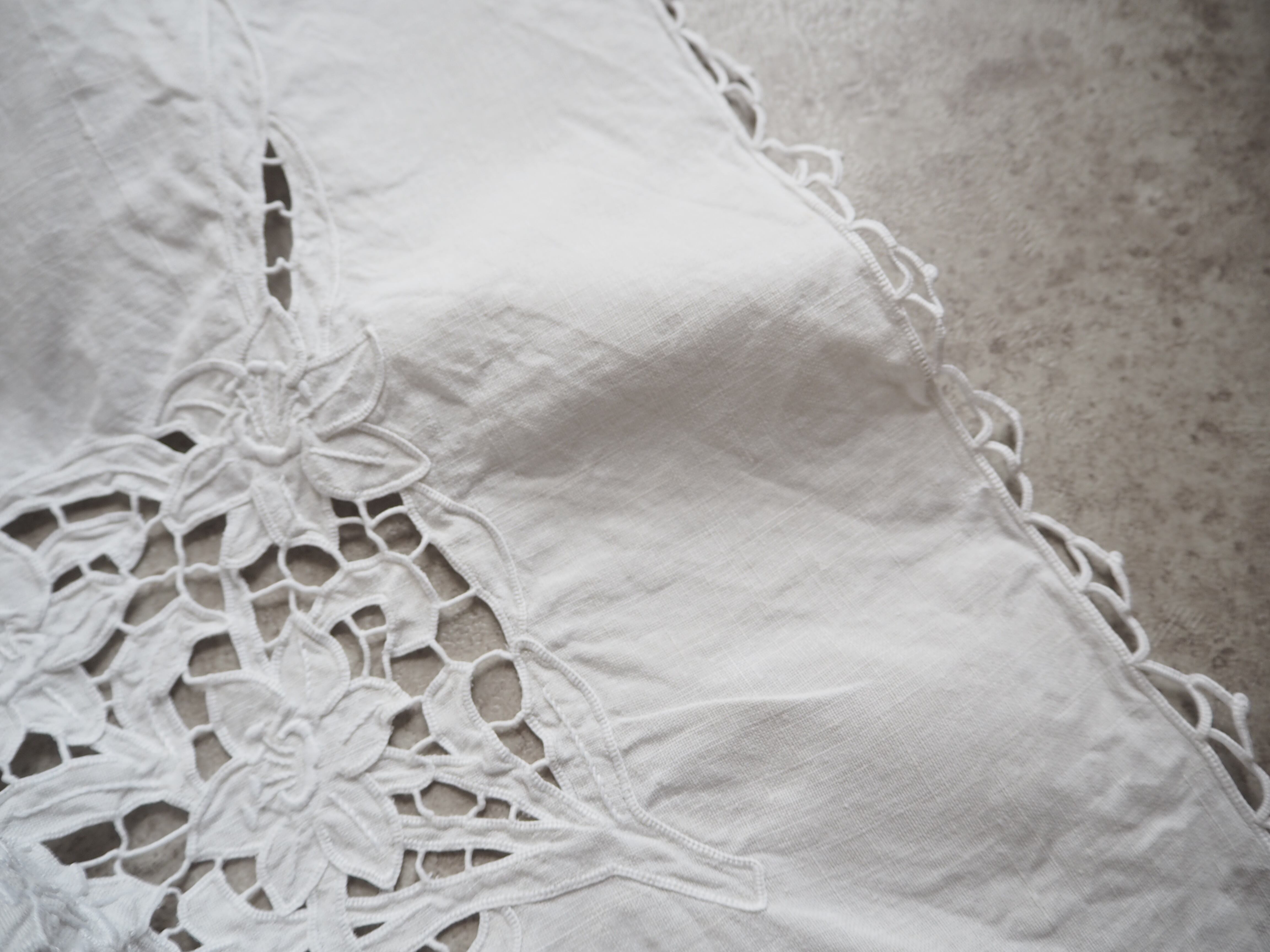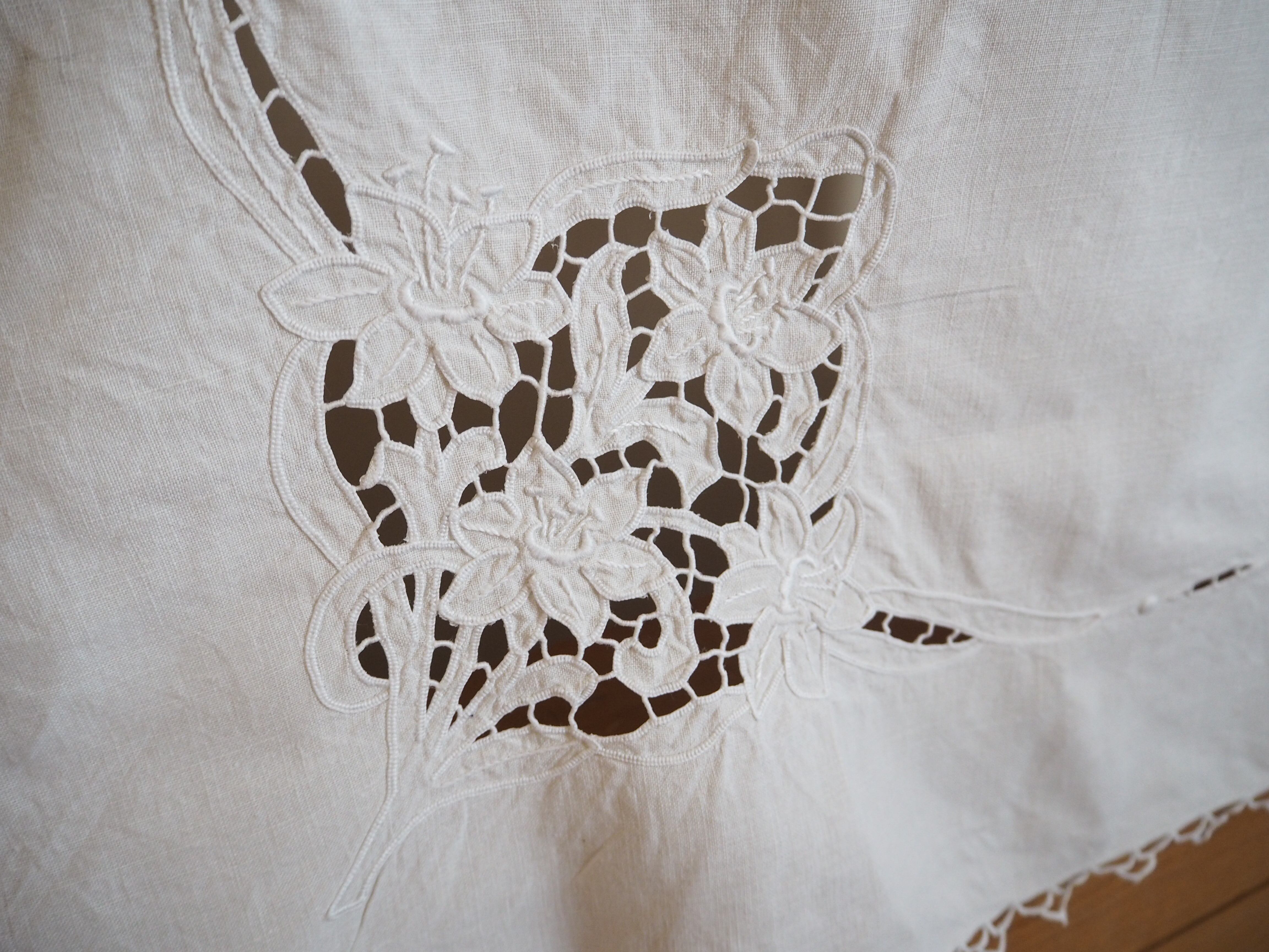 縁取りのレースもとても可愛く、ユリの刺繍がエレガントなので、レース部分の程よい甘さがとても素敵な仕上がりになっているテーブルクロスです。