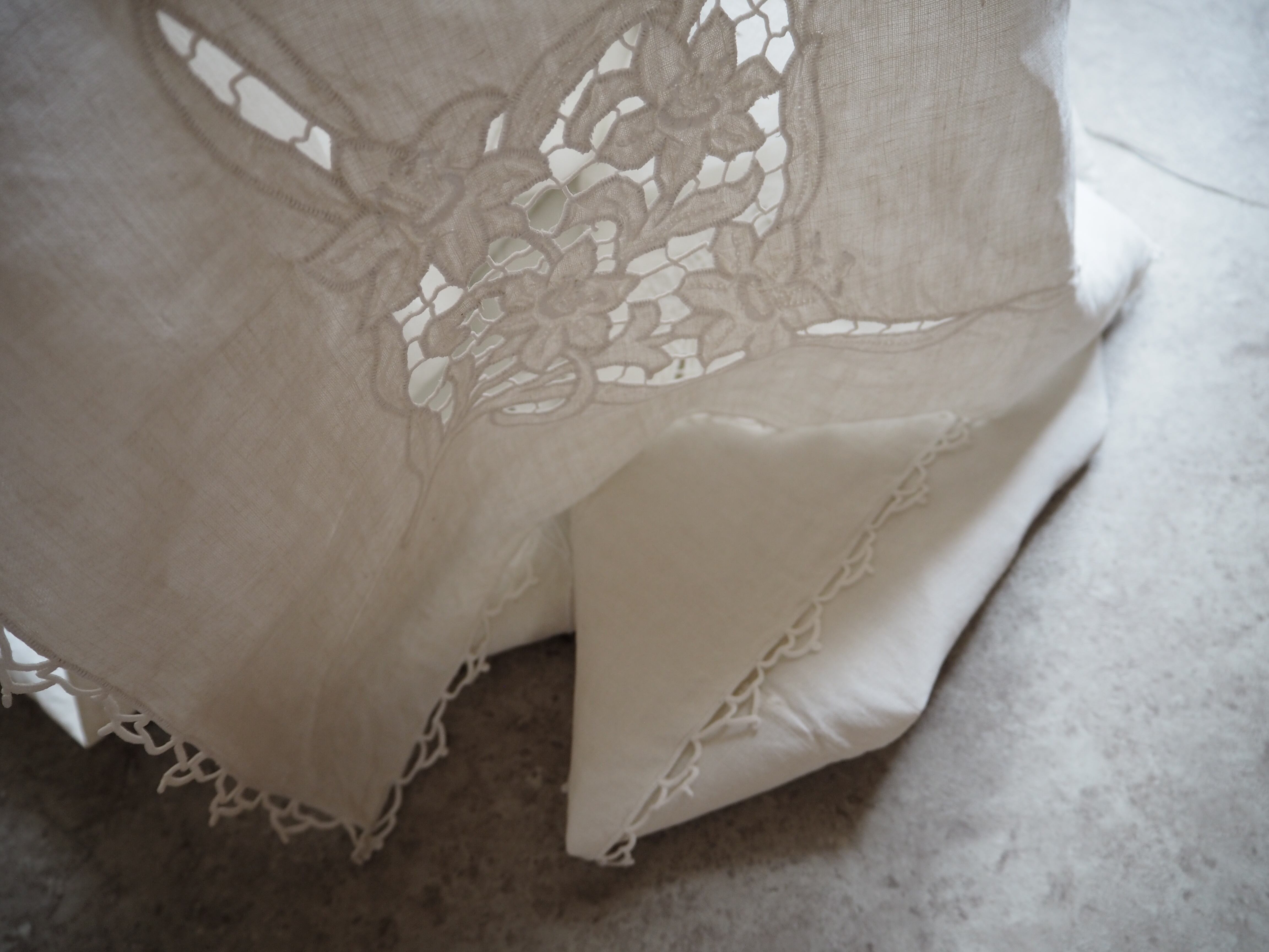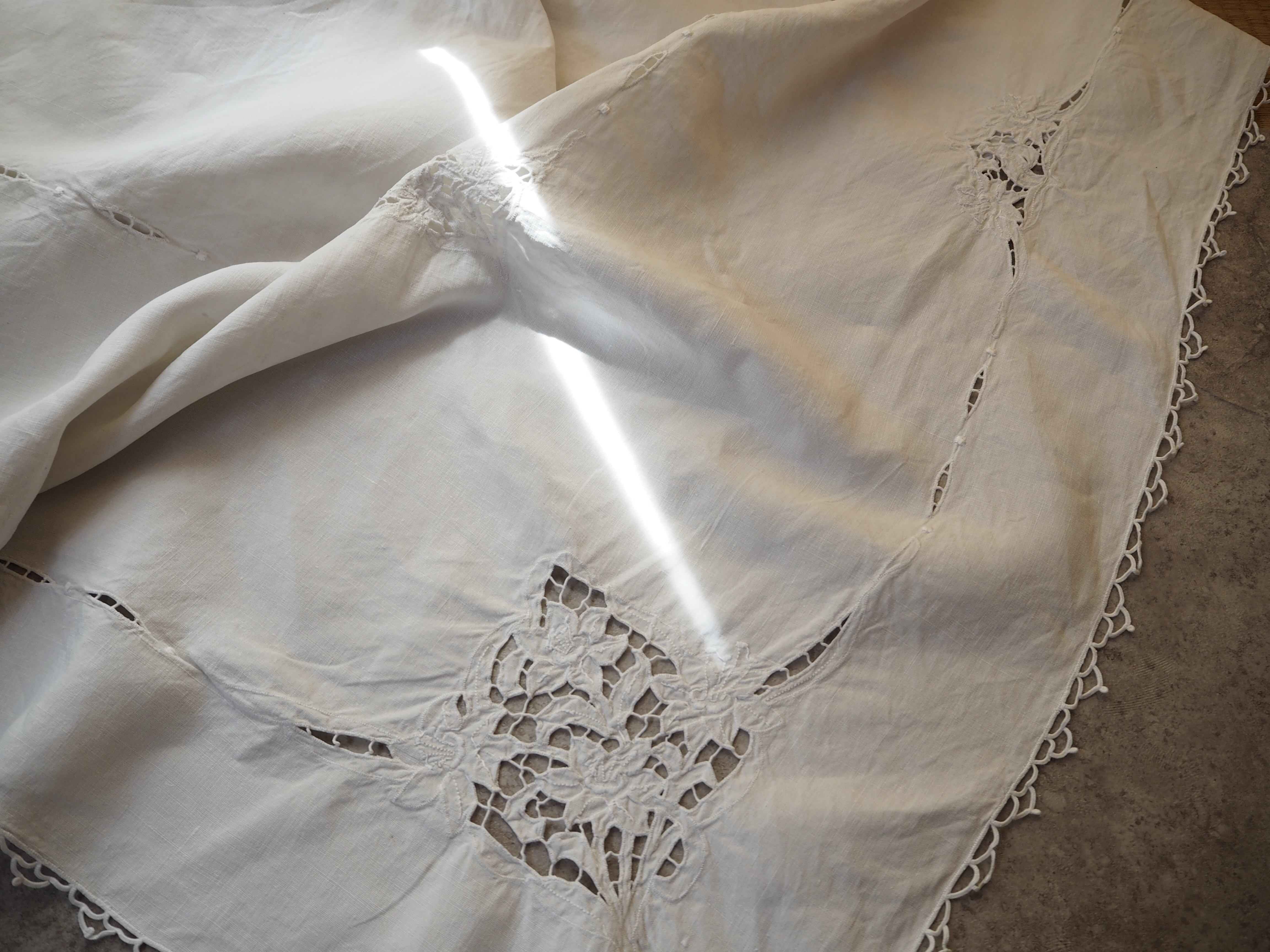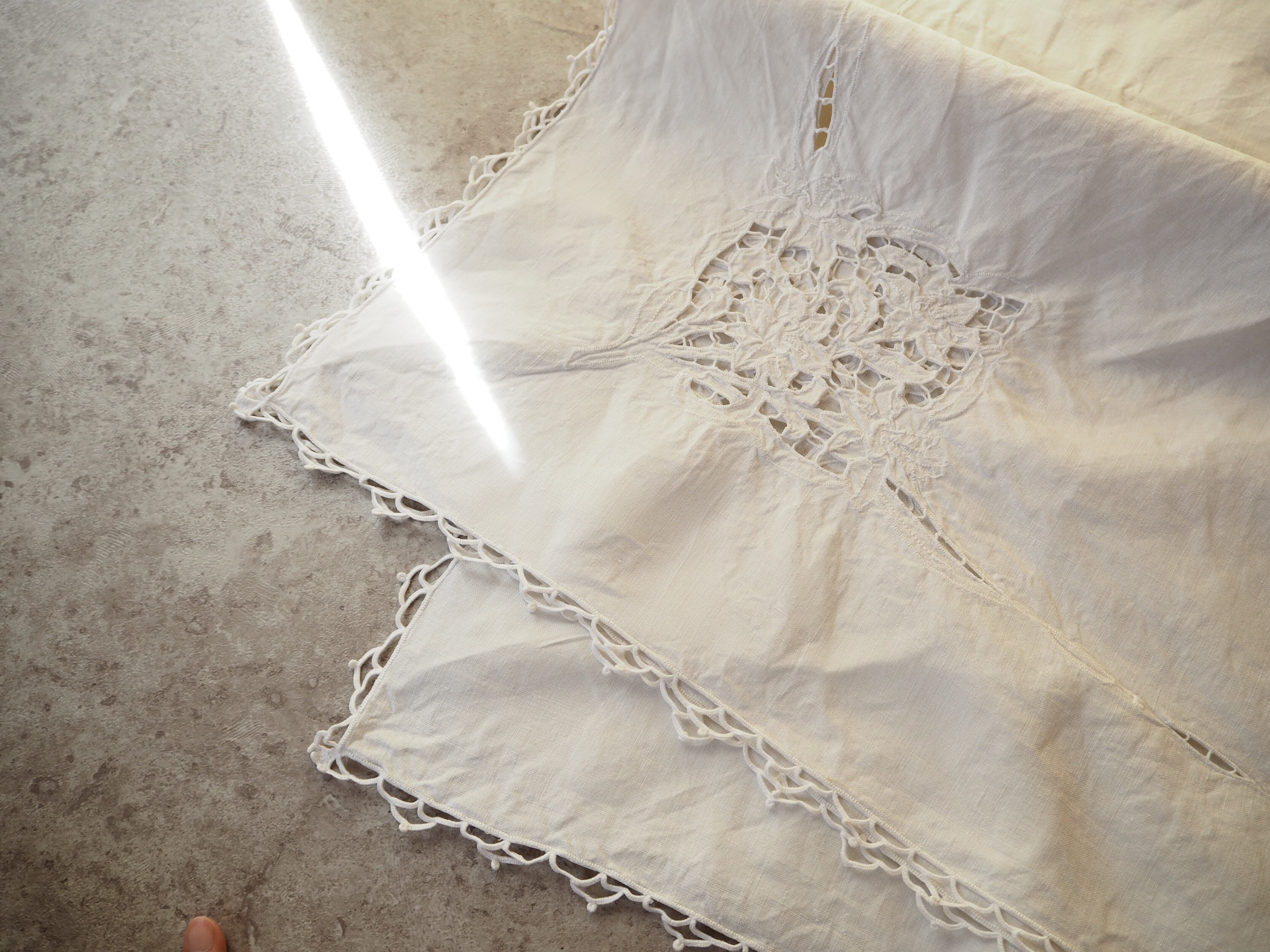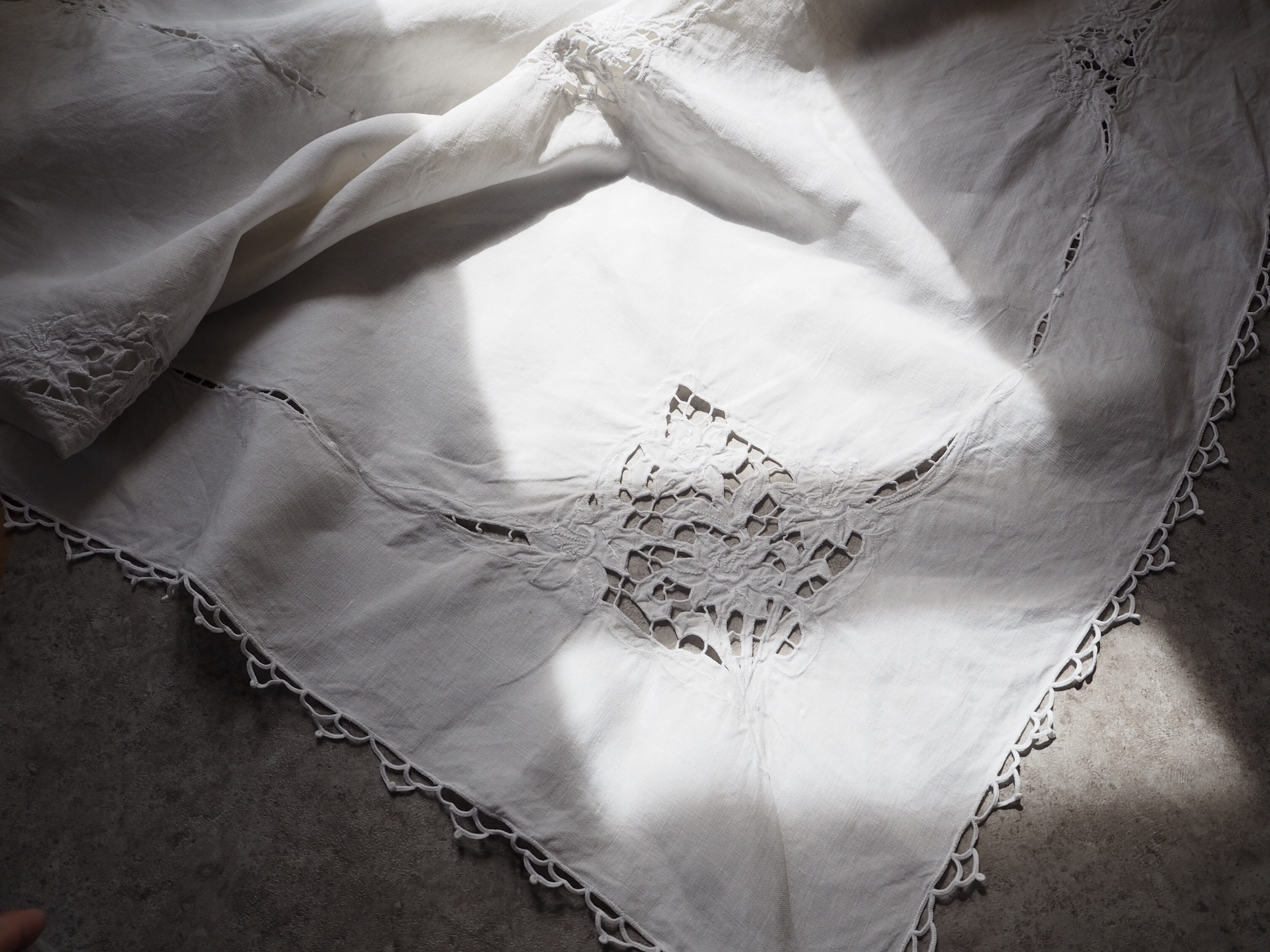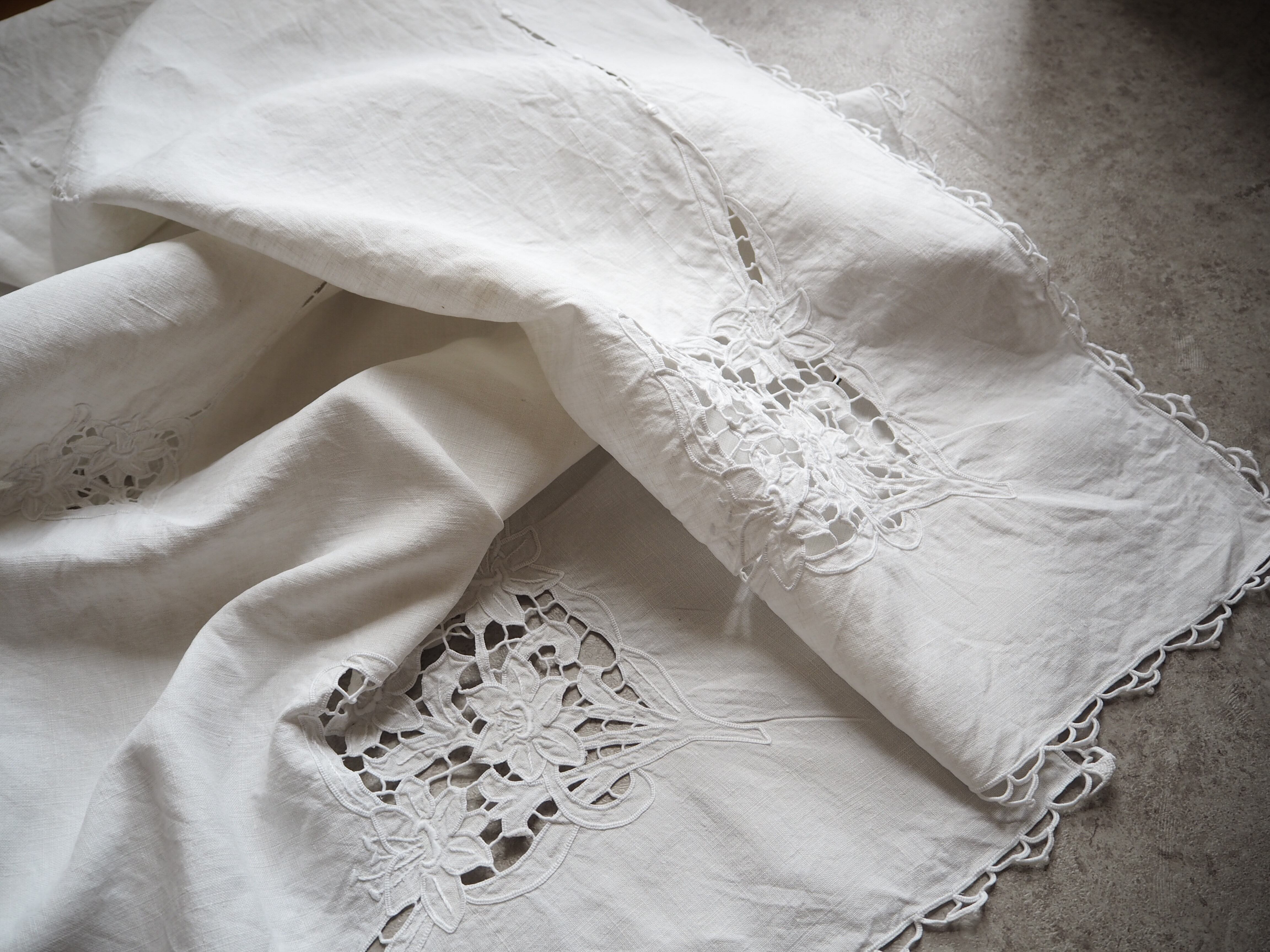 縁取りのレースもとても可愛く、ユリの刺繍がエレガントなので、レース部分の程よい甘さがとても素敵な仕上がりになっているテーブルクロスです。
