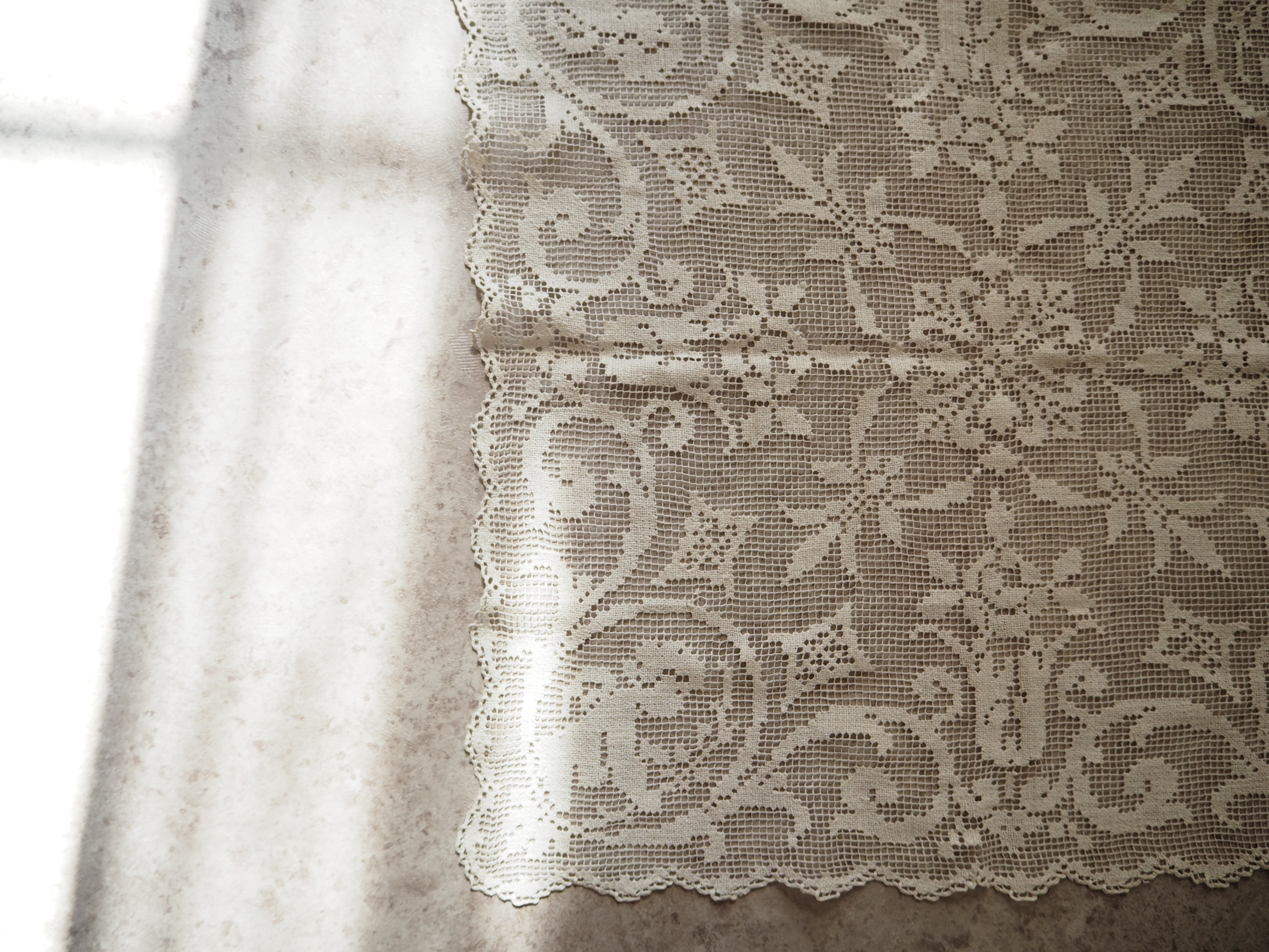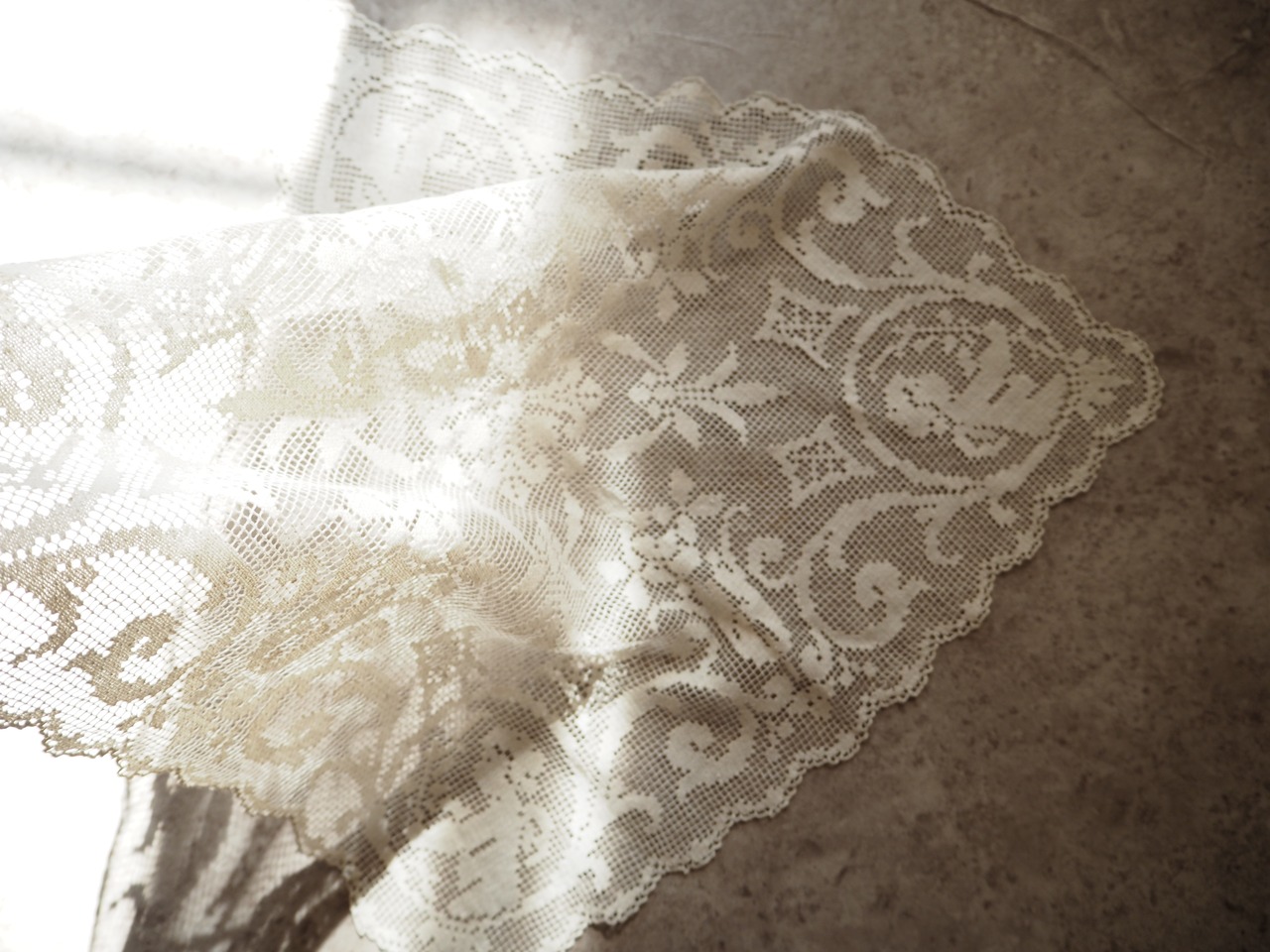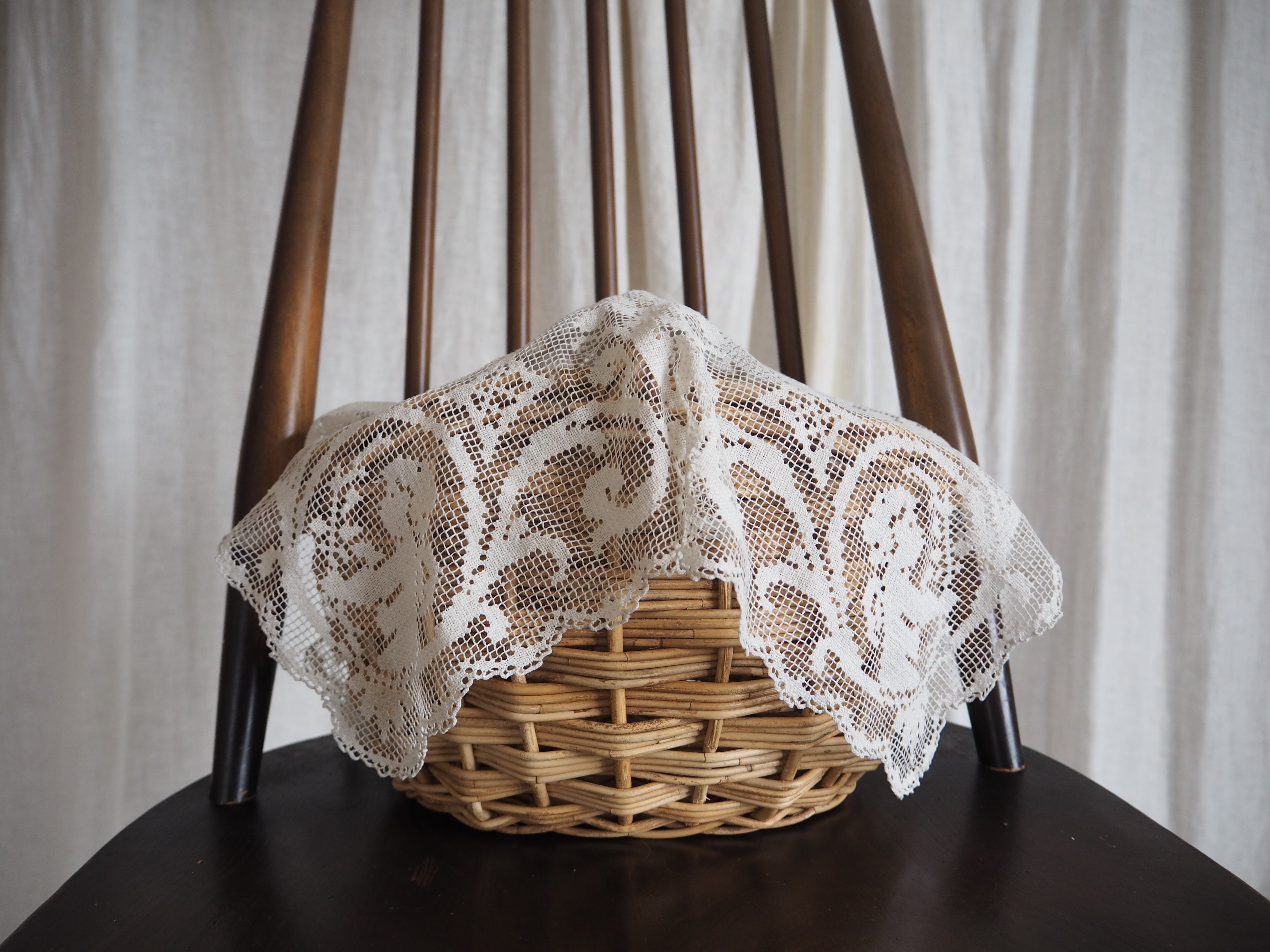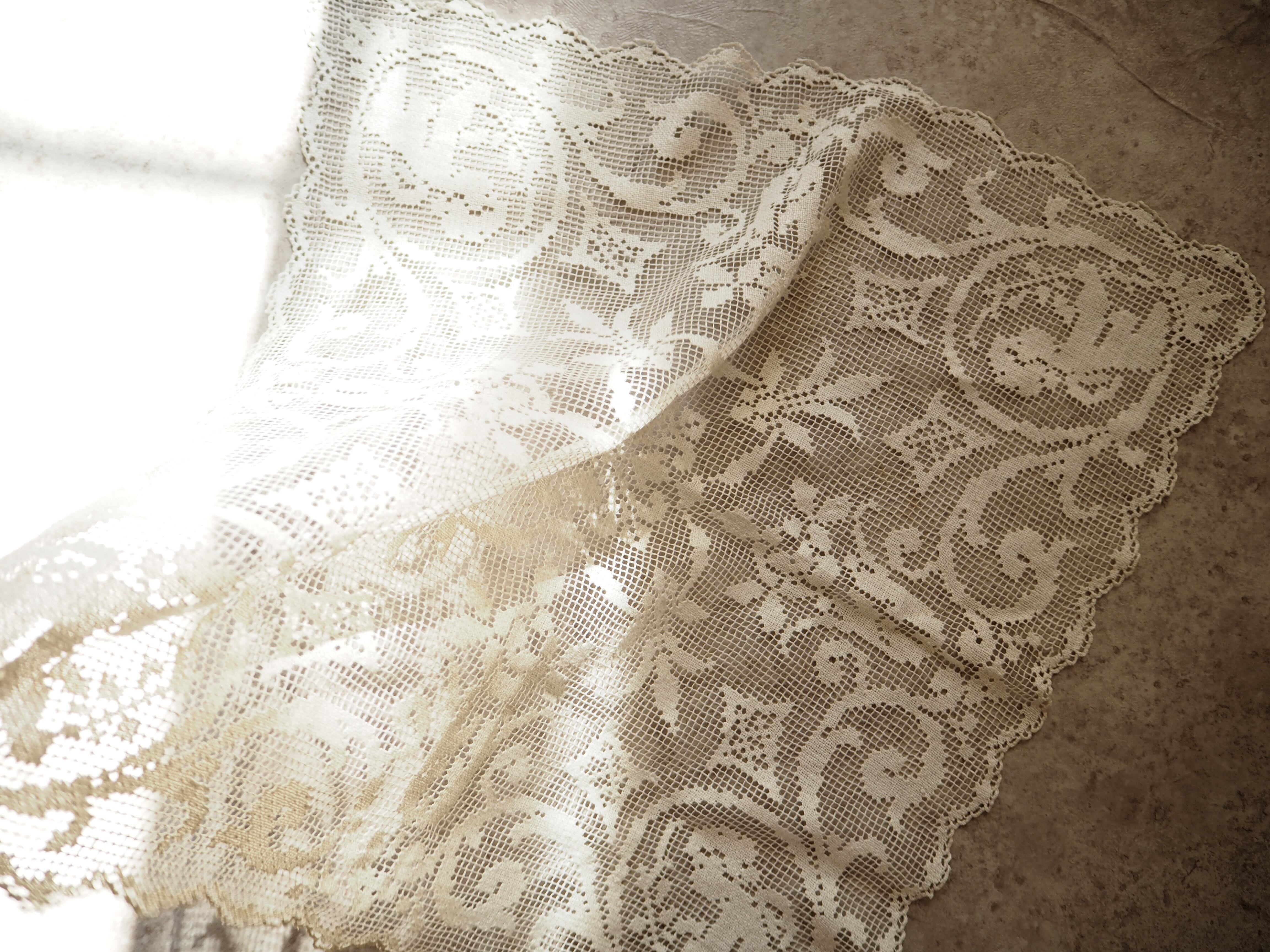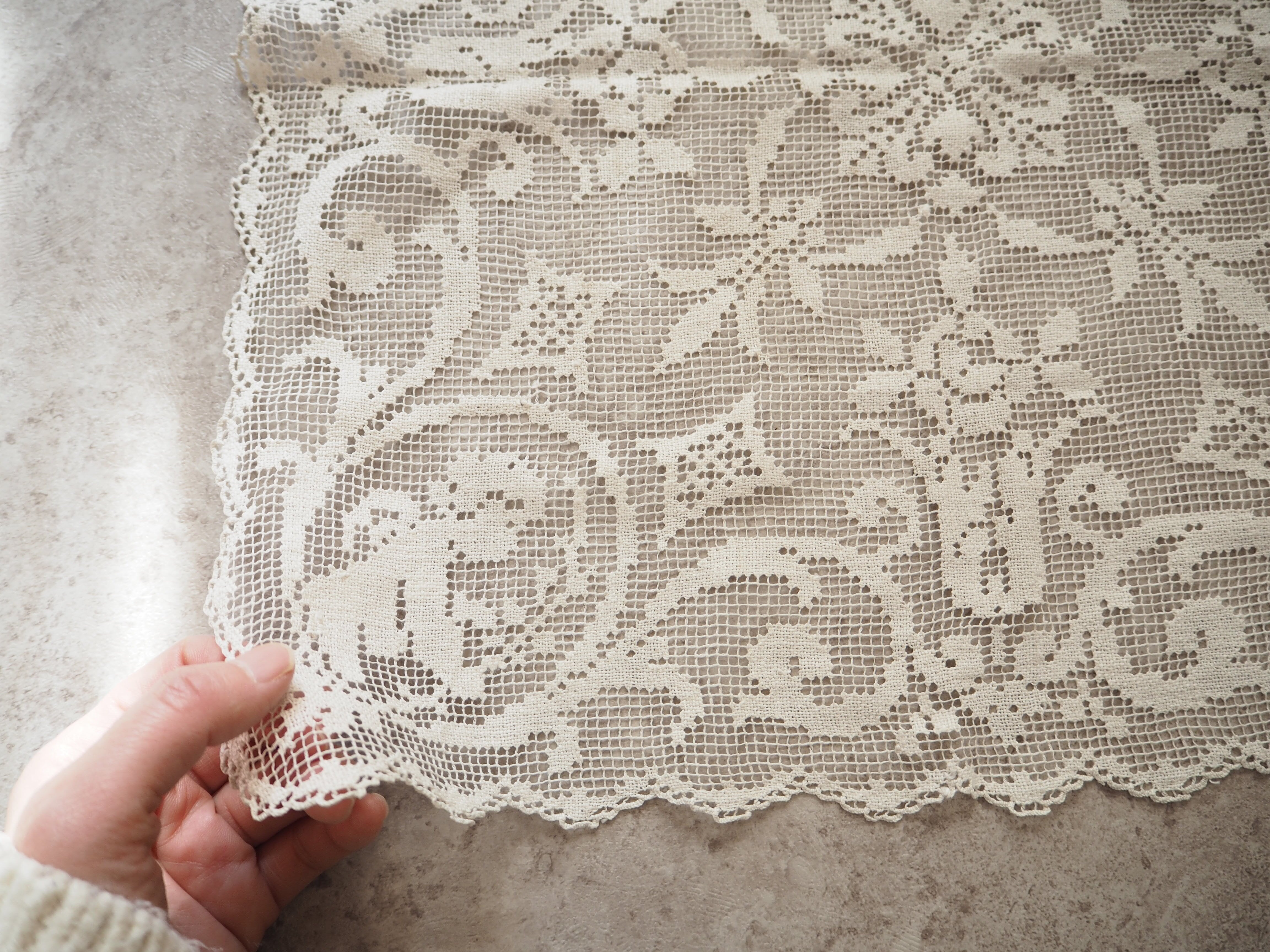 天使がとてもかわいいほっこりとしたあたたかみのあるフィレレース。バラのお花や、天使が月桂樹の葉っぱを持っていて愛らしいレースです。